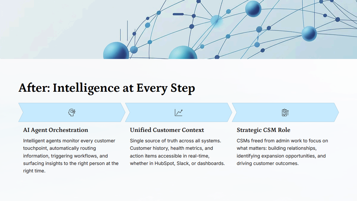 - Significant time saved for CSMs, with several hours of work automated across onboarding and adoption.