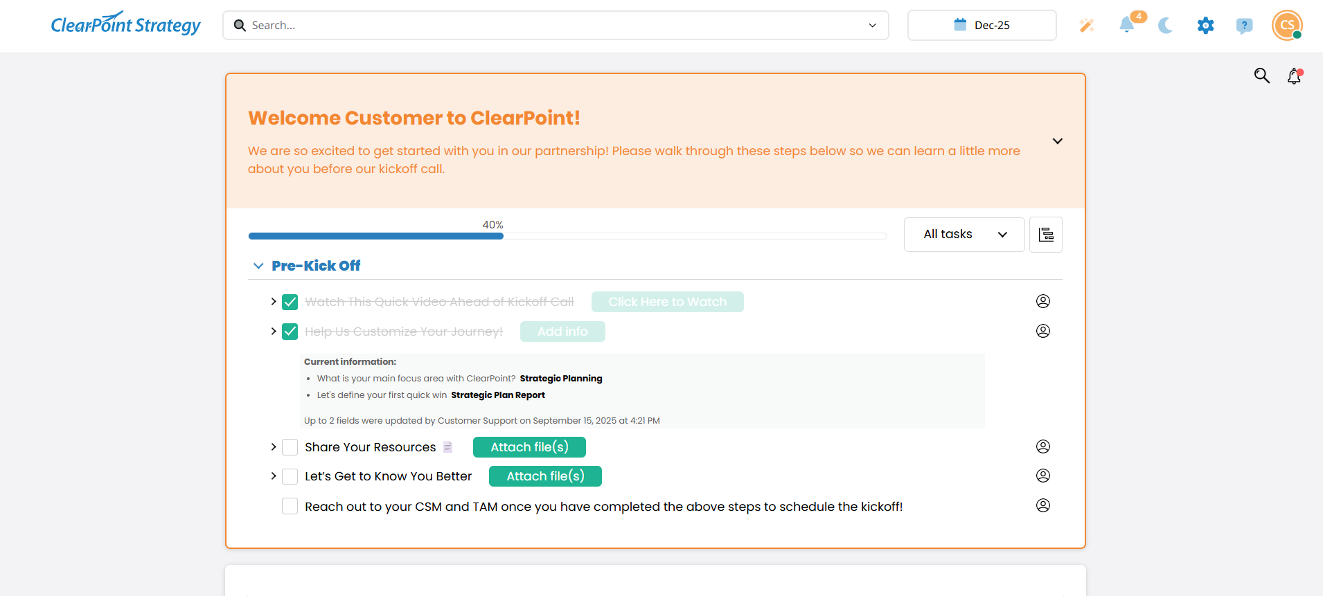 - Dedicated sections for product updates, company news, CSM-led discussions, presentations, EBRs, and follow-up tasks.