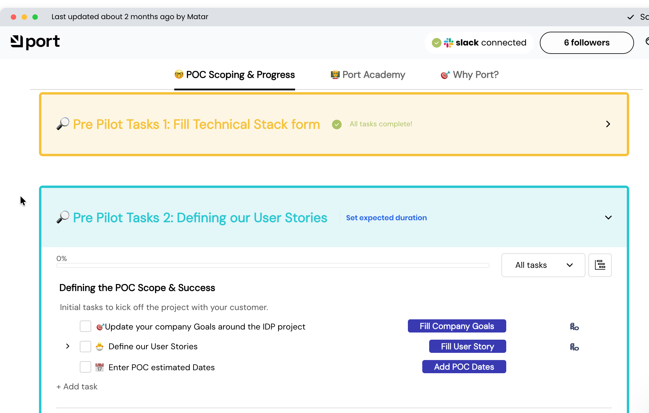 Port.io’s Proof of Concept process was technically strong but lacked structured learning, storytelling, and business context. Sales Engineers captured information in different ways, making it difficult for Customer Success Managers to pick up after the sale and continue the value conversation. The opportunity was clear: create a unified onboarding framework that blended technical enablement, structured discovery, and centralized tracking so every POC became a repeatable, data rich journey with a seamless transition into customer success.