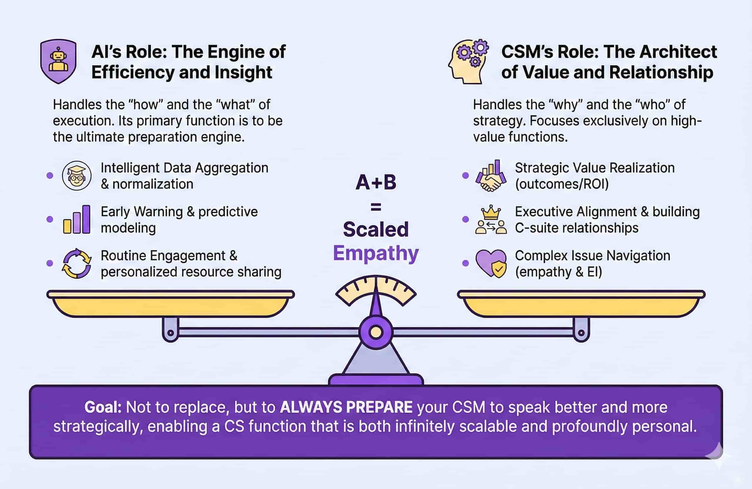 The most successful Customer Success teams are moving past this binary choice. They are not asking, "AI or Human?" They are mastering the Human-AI Balance to establish what we call the Empathy Algorithm. This framework dictates that AI and automation must be strategically employed to augment the human Customer Success Manager (CSM), freeing them from the mundane to focus entirely on strategy, relationship-building, and value realization. The result is a CS function that is both infinitely scalable and profoundly personal.