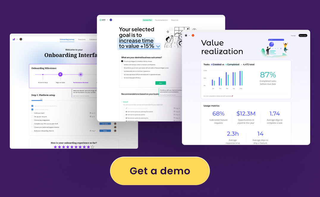 Personalized Content Delivery: The interface delivers specific, AI-curated content (training videos, best practice guides, feature announcements) only when and where it is relevant to the customer's immediate stage in their success plan, maximizing engagement and time-to-value.